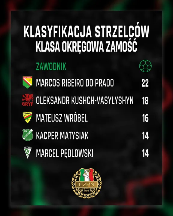 SPORTW ligach piłkarskich trwa zimowa przerwa, ale w cieniu rywalizacji trwa też wyścig o koronę króla strzelców. O tyle ważny, że w goli głównej piłkarze z klubów z powiatu zamojskiego. W IV lidze po koronę idzie Dominik Skiba z Hetmana, w okręgówce ton nadają Oleksandr Kushch-Vasylyshyn z Gryfa i Mateusz Wróbel z BKS Bodaczów, a klasie A - Mateusz Dziurdza z Sokoła Zwierzyniec. Zobaczcie zestawienie najskuteczniejszych snajperów na półmetku sezonu.