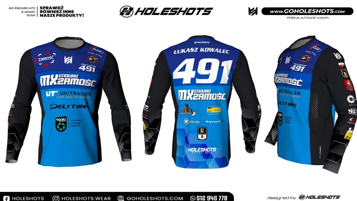 Centralne miejsce na froncie zajmuje dumnie wyeksponowana nazwa klubu, którą otacza precyzyjnie przemyślany układ logotypów partnerów i sponsorów. Jest tu logo Zamościa, znak Holeshots (producenta odzieży sportowej), oraz oczywiście numer startowy, do tego imię i nazwisko zawodnika. Na nowej koszulce są także