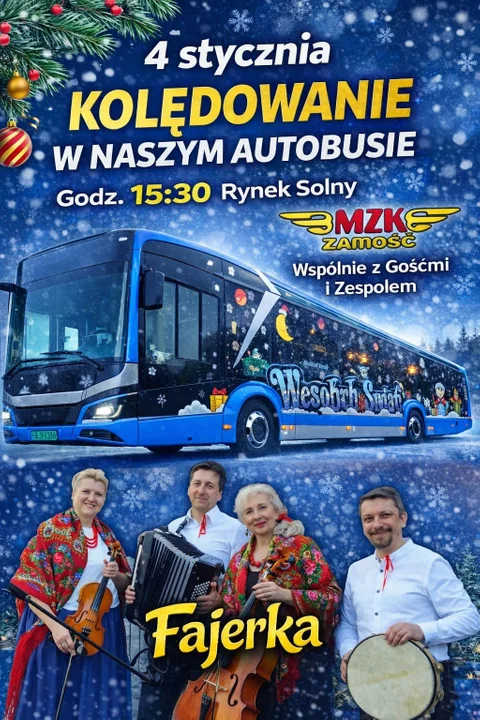 Specjalny świąteczno-kolędowy autobus wyruszy na trasę o godzinie 15:30 na Rynku Solnym w Zamościu. W autobusie zabrzmią najpiękniejsze kolędy, które wspólnie wykonają pasażerowie, zaproszeni goście oraz zespół Kapela „Fajerka” – Frajda znad Wieprza".