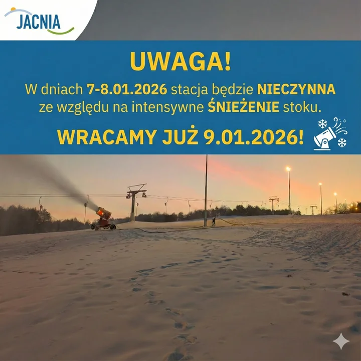 - Kochani, robimy krótką przerwę techniczną na naśnieżanie. Chcemy, żeby warunki były perfekcyjne przez całą zimę! W środę i czwartek stacja nieczynna. Ładujcie baterie (i nogi), bo weekend zapowiada się świetnie! Do zobaczenia w piątek! - informują prowadzący stację narciarską w Jacni.